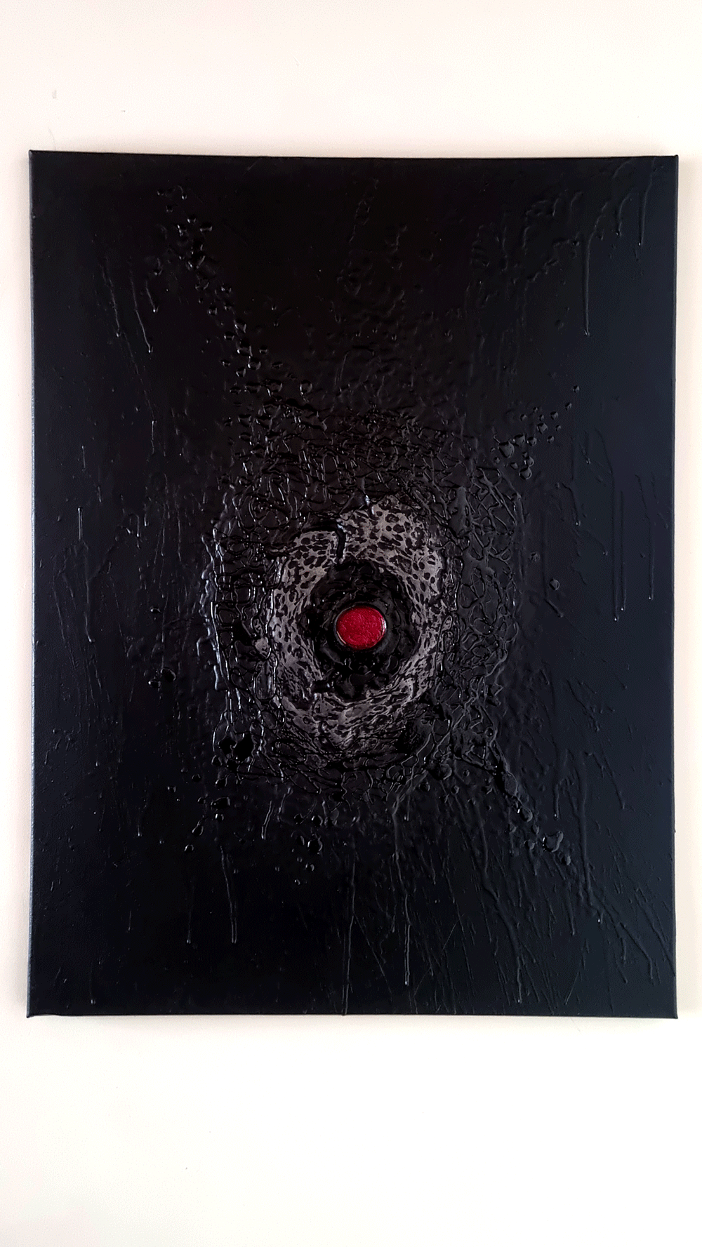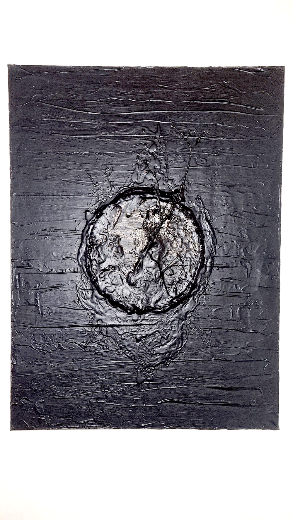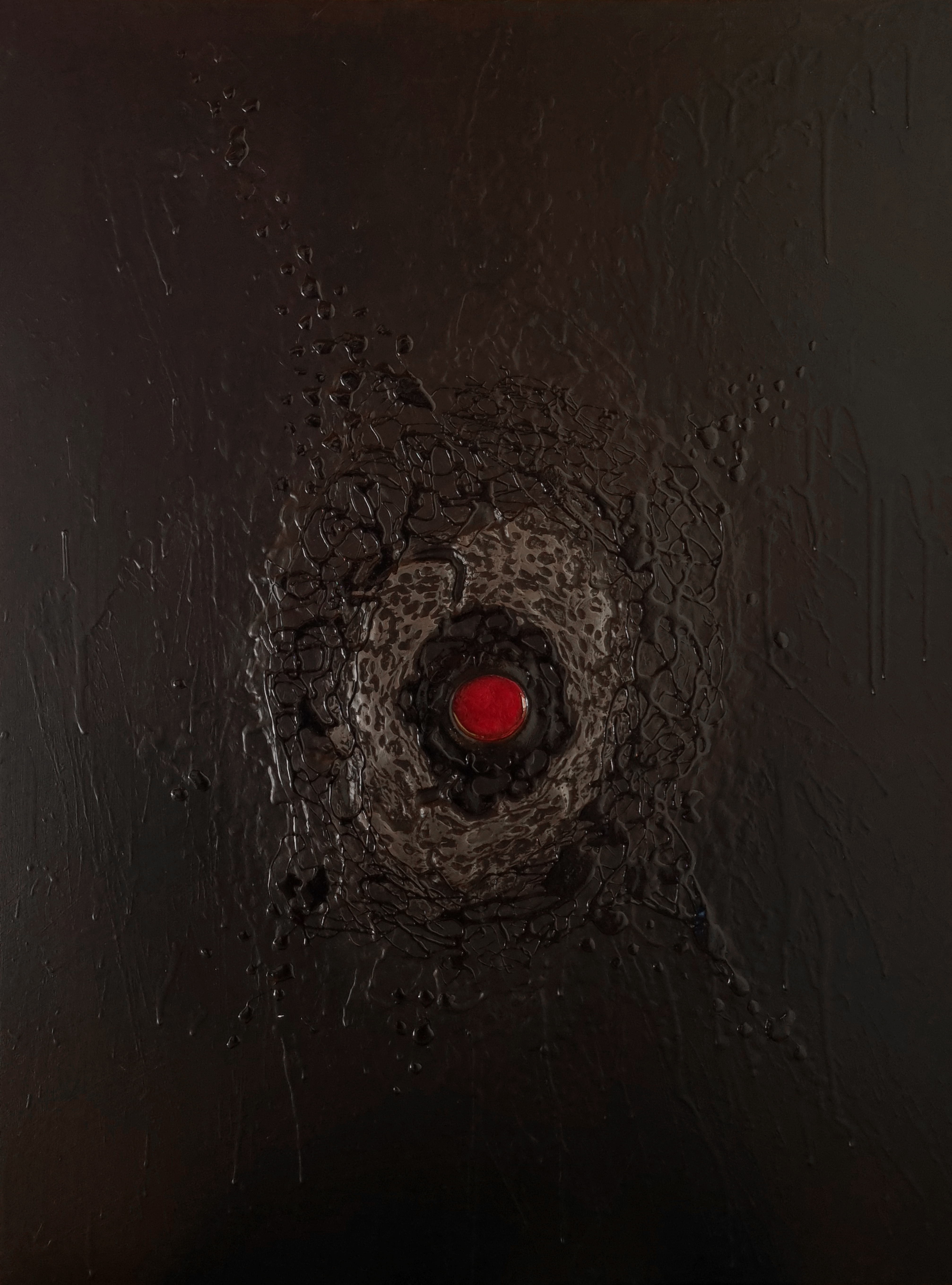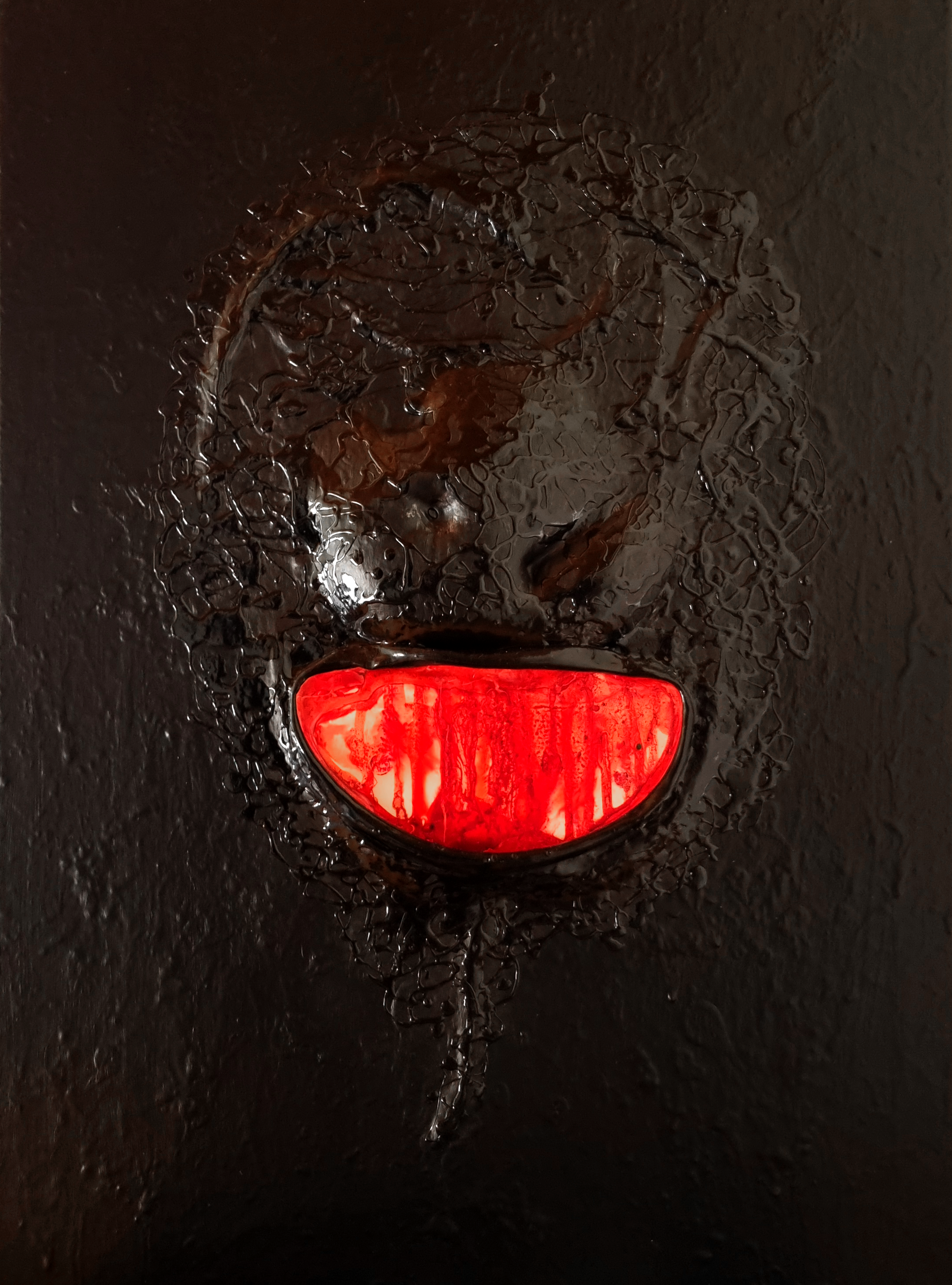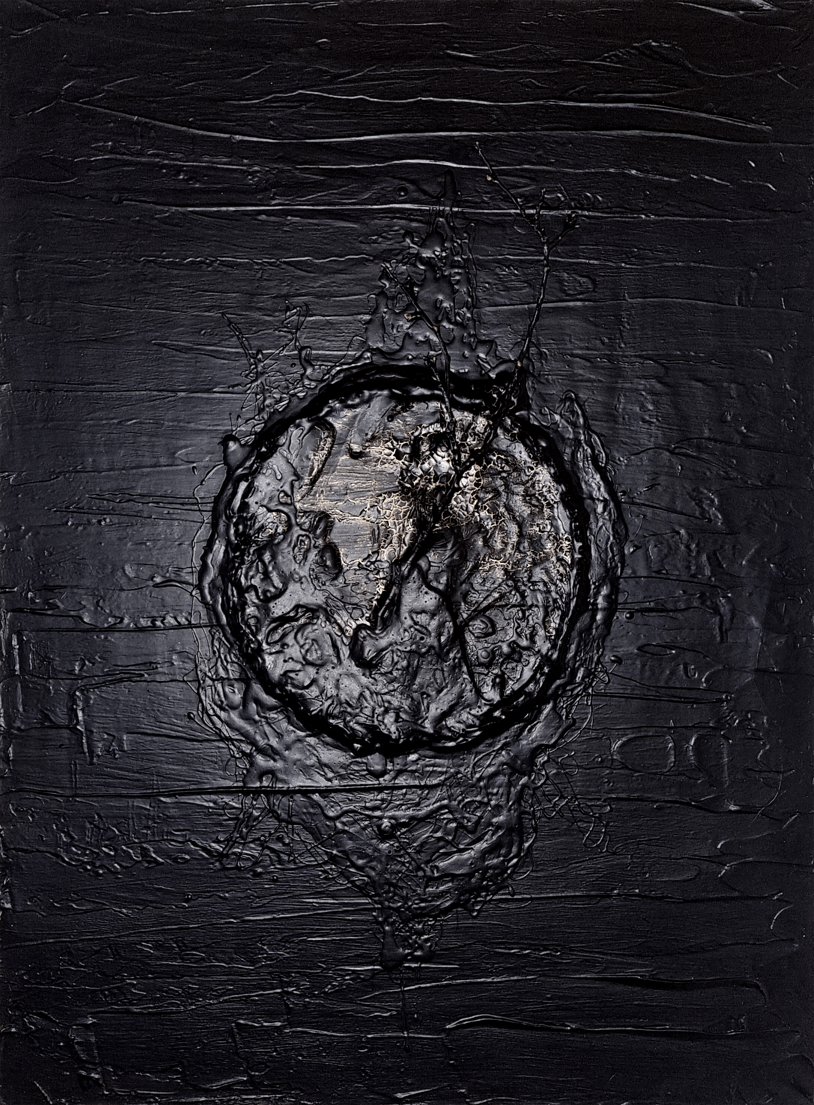 The black relief mass evokes existential tension and the depths of corporeality, while colors or reflective accents act as dramatic points of rupture, introducing dimensions of life and pain.