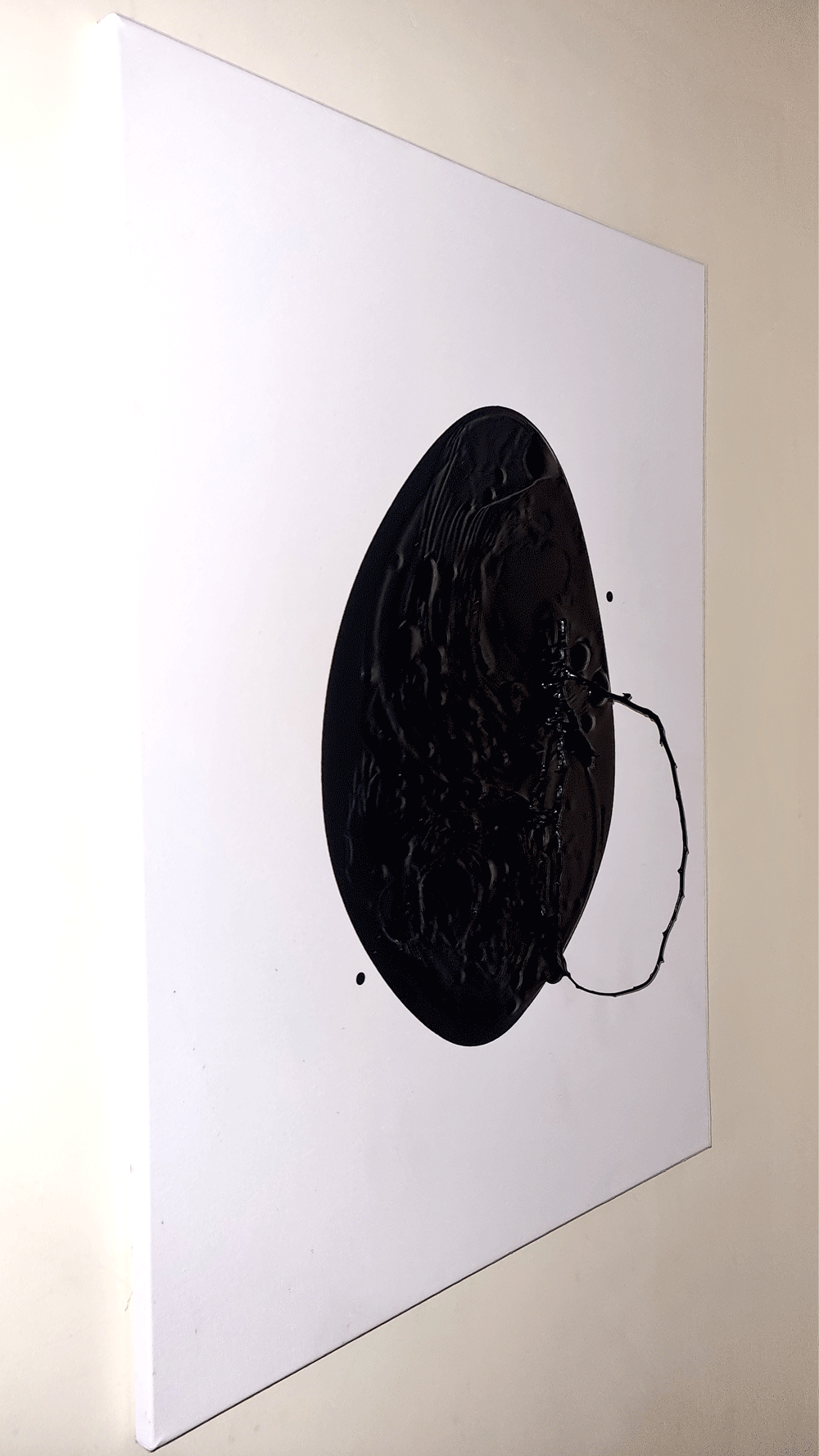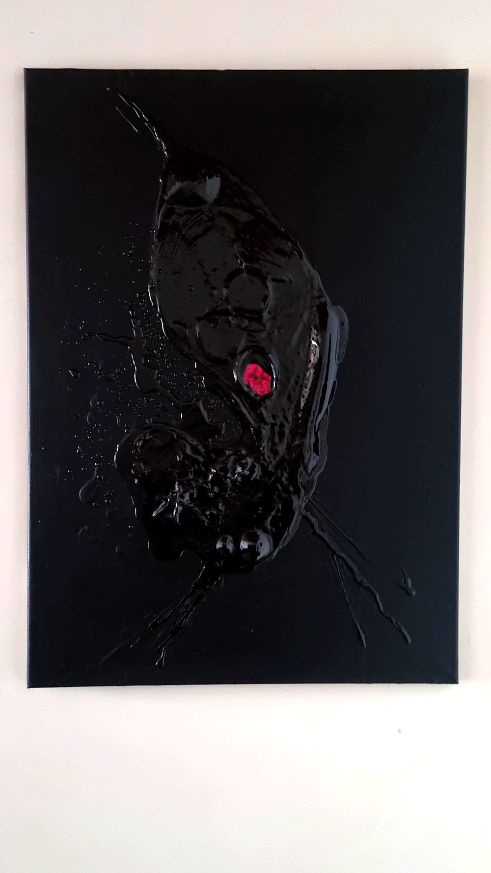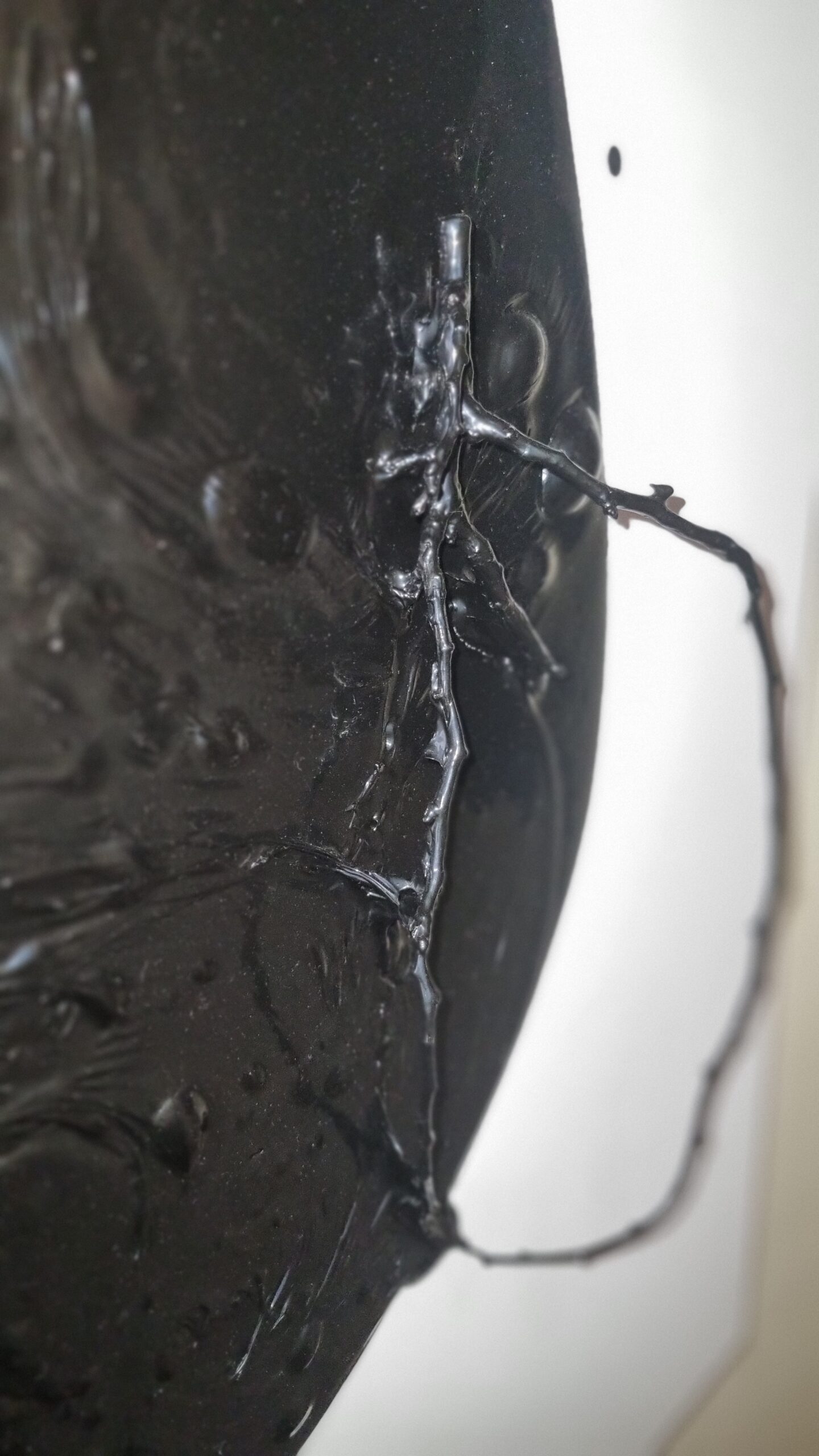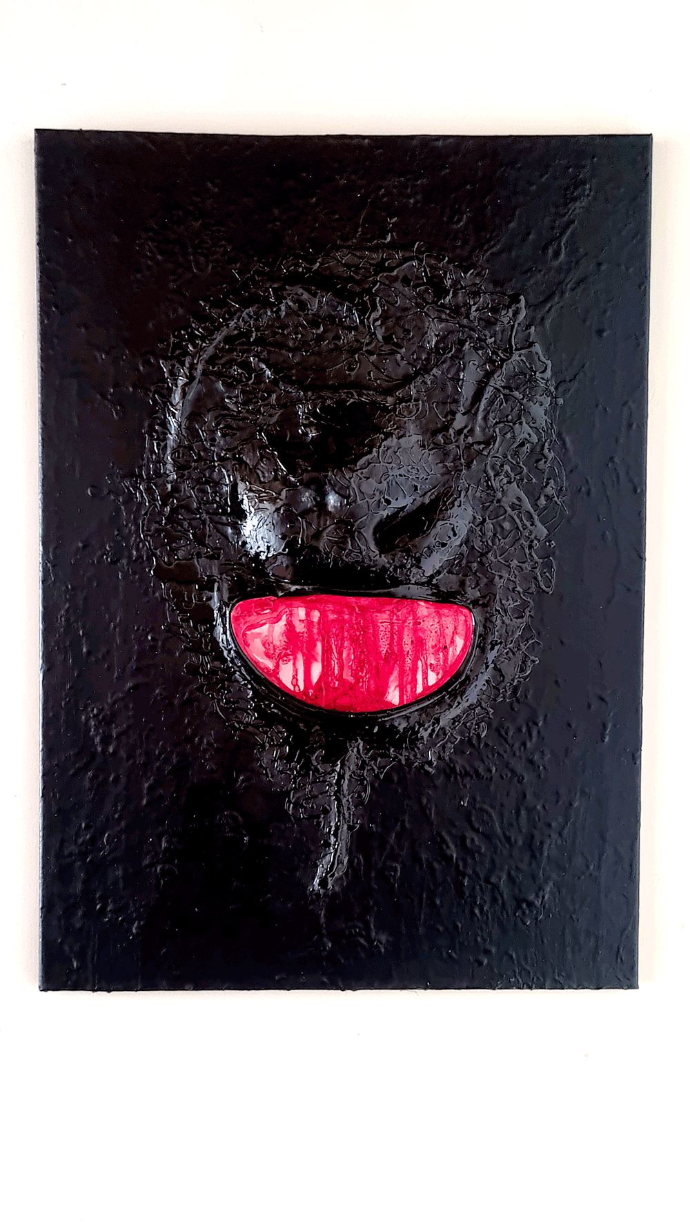 The black relief mass evokes existential tension and the depths of corporeality, while colors or reflective accents act as dramatic points of rupture, introducing dimensions of life and pain.