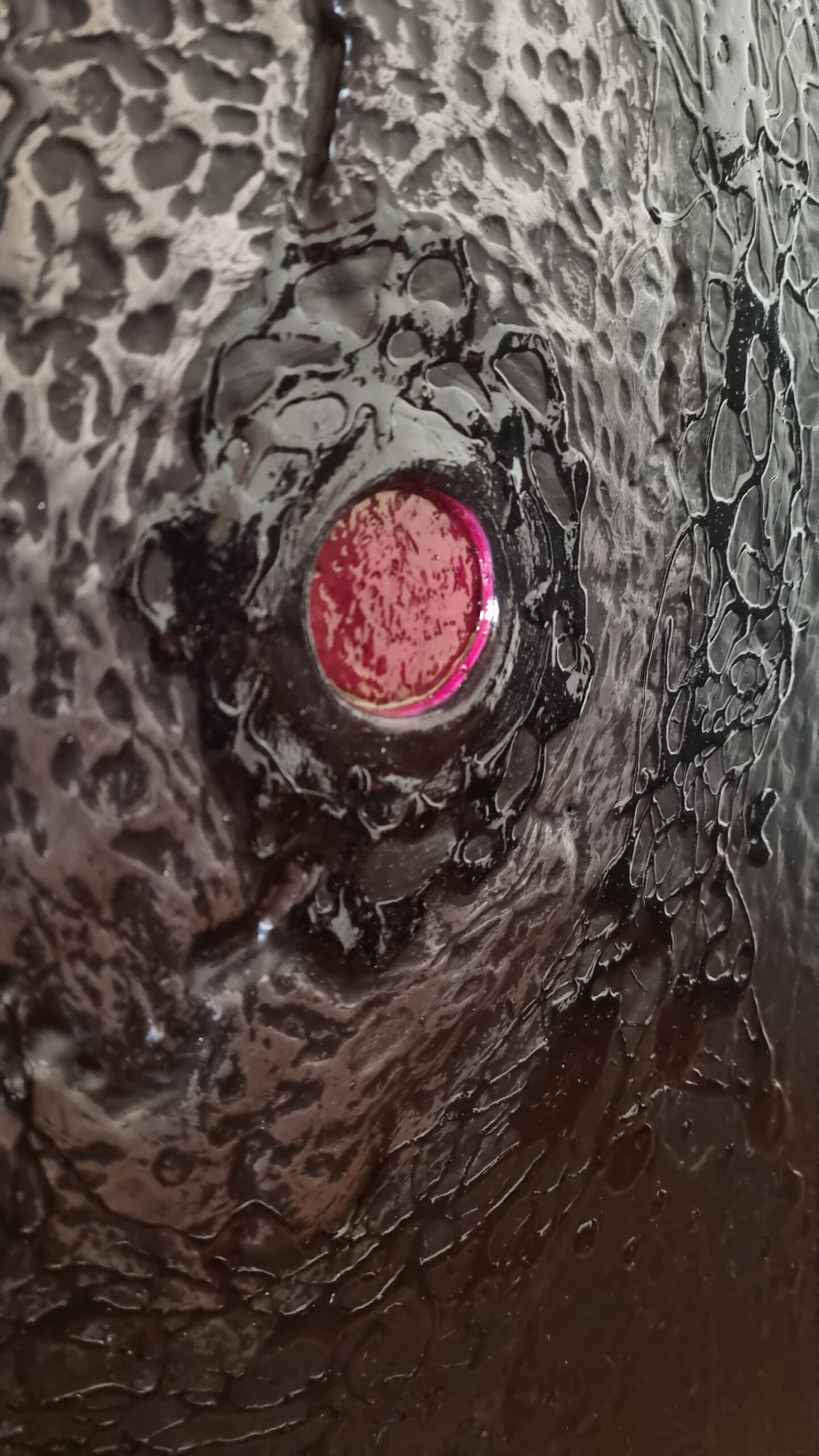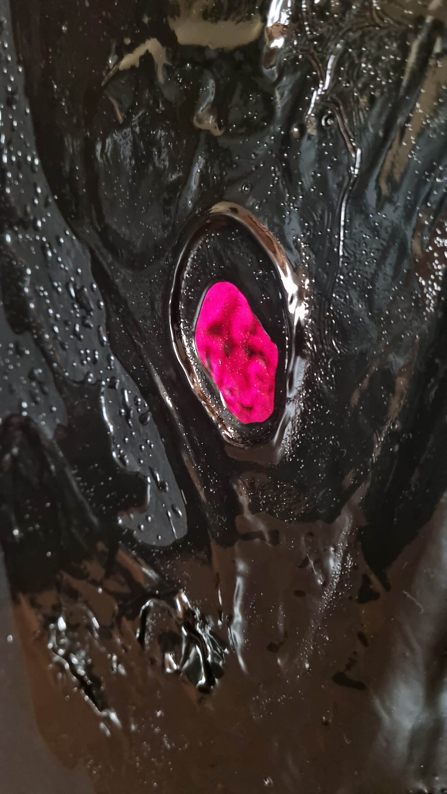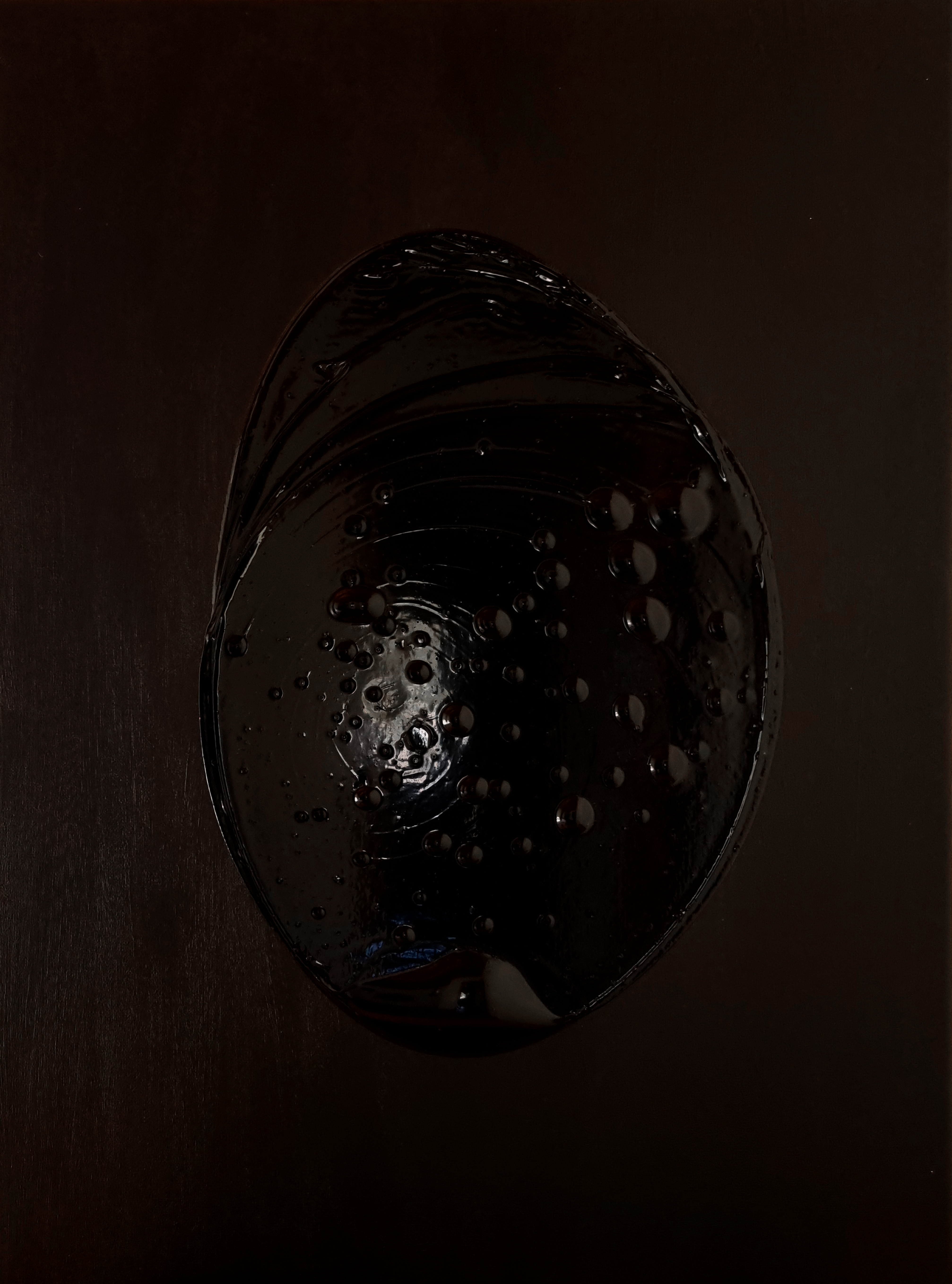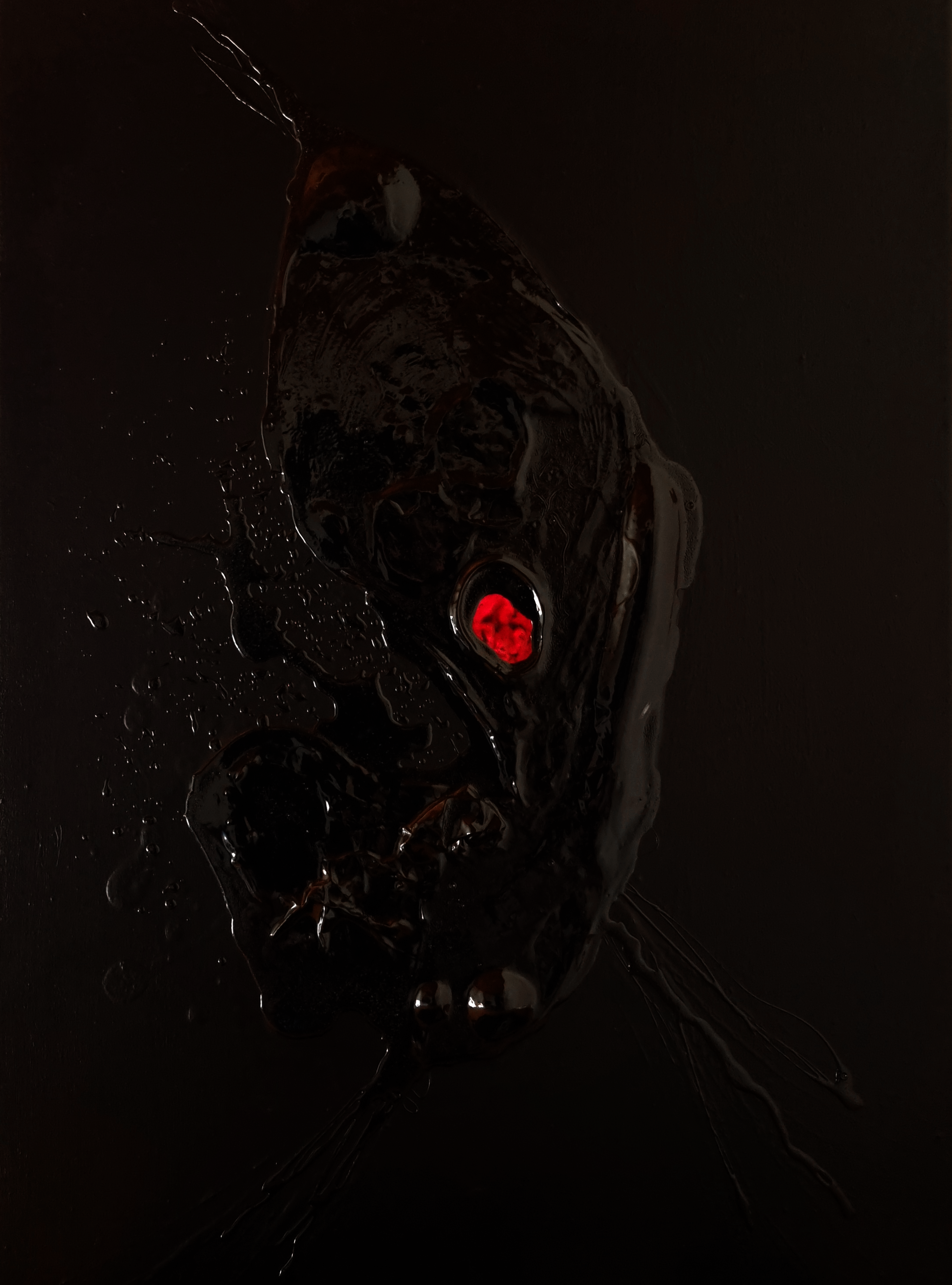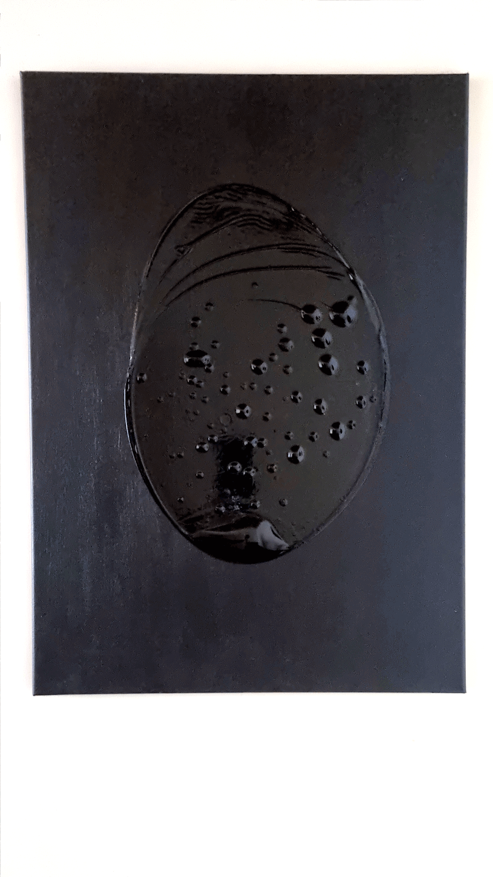 The black relief mass evokes existential tension and the depths of corporeality, while colors or reflective accents act as dramatic points of rupture, introducing dimensions of life and pain.