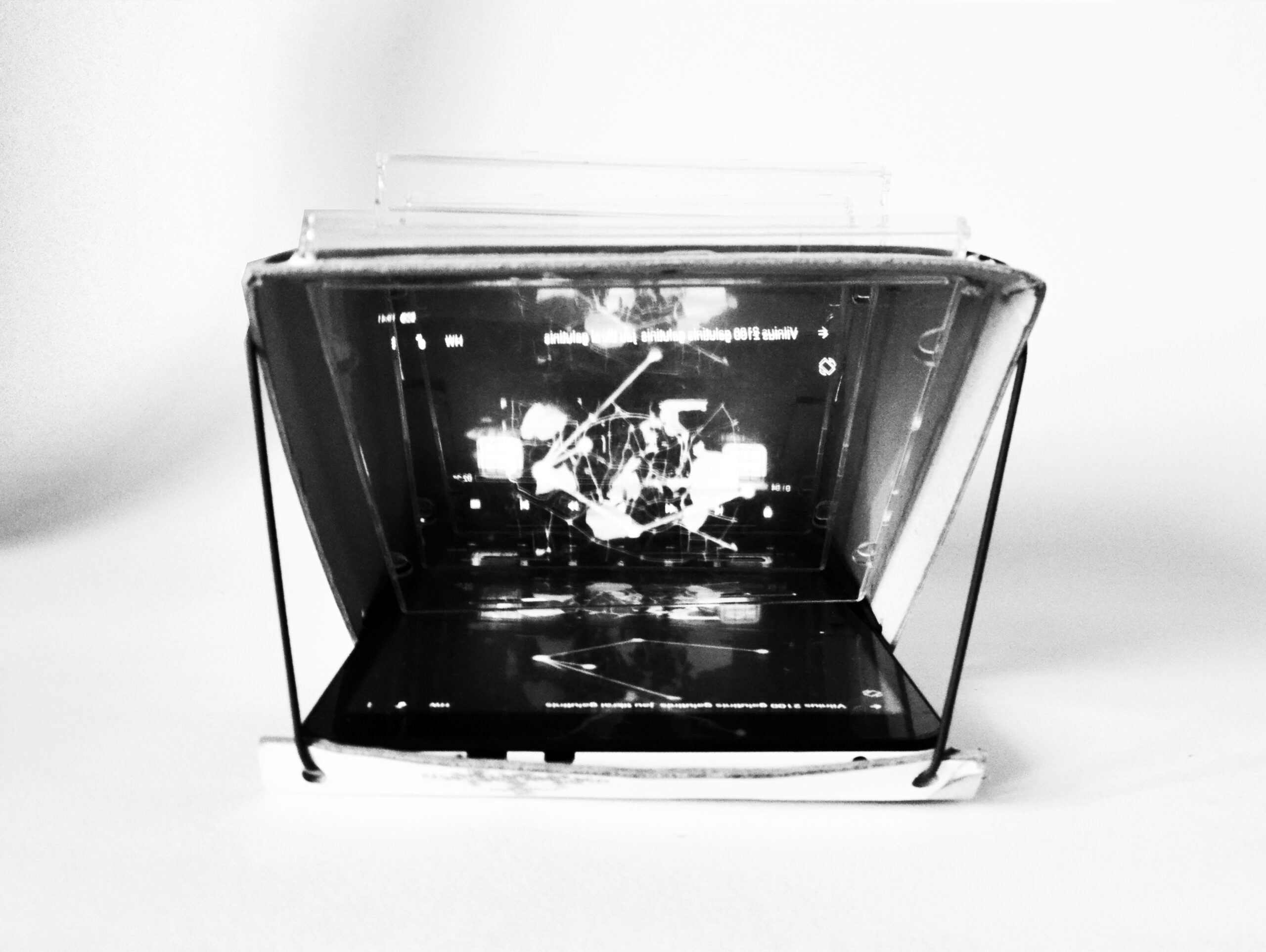 A holographic illusion of depth, created by three facing reflections on transparent surfaces, mirrors the illusory space birthed by a triptych of screens projecting a future built from recycled materials.
